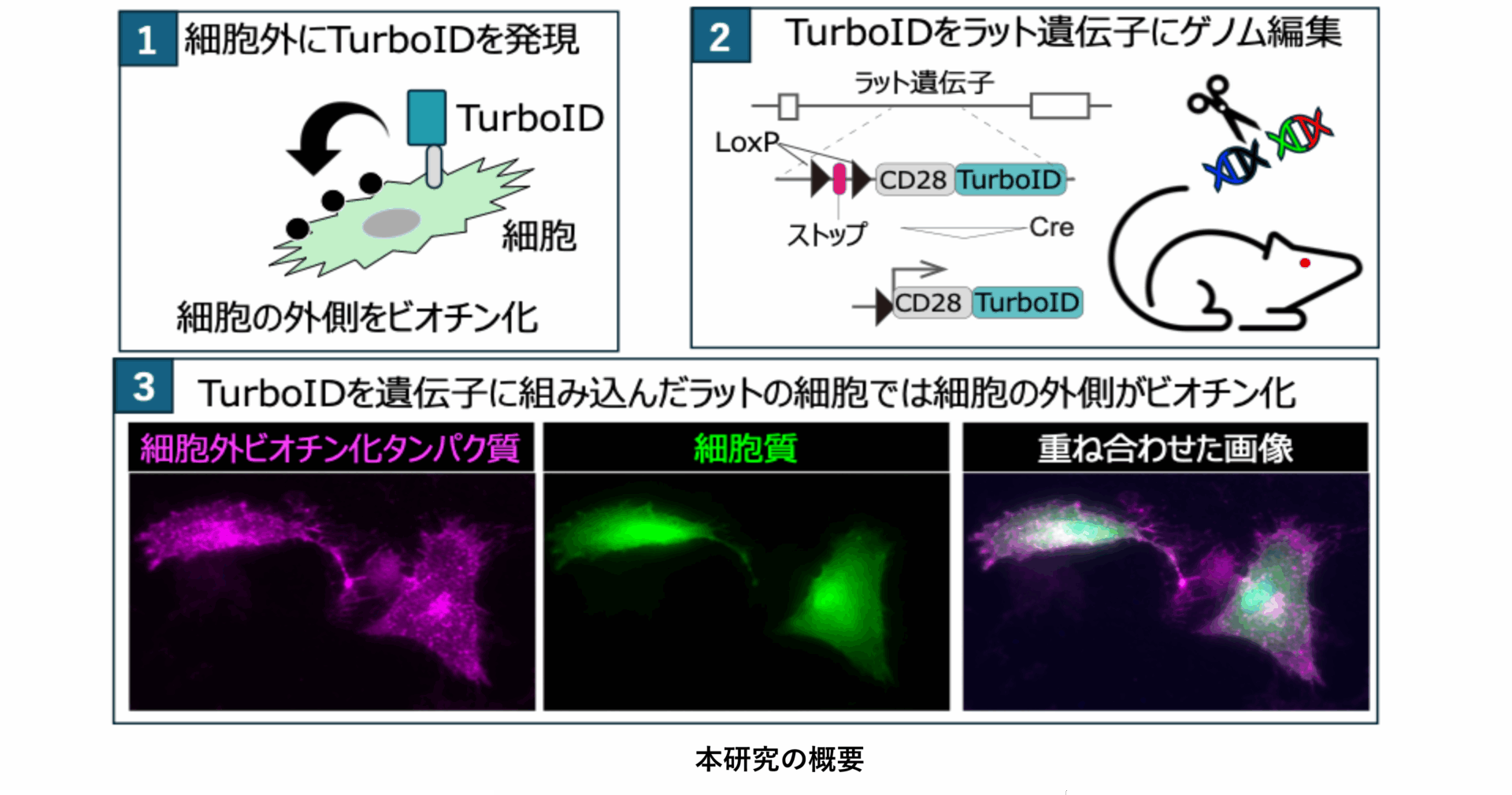 岐阜大学 工学部 自然科学技術研究科修士1年の井藤 茶羅さん、中村 克行 助教、上田 浩 教授、纐纈 守 教授、高等研究院 One Medicineトランスレーショナルリサーチセンター (COMIT)の村田 知弥 特任准教授、東京大学大学院農学生命科学研究科 獣医生理学教室の山内 啓太郎 教授、NOMON株式会社(現NOMON & Co株式会社)の狩野 理延 博士、中島 良太 博士、山名 慶 博士らの研究グループは、特定の細胞の細胞膜外側に存在するタンパク質を特定することを目的に、ビオチンリガーゼTurboIDを細胞外に発現させ、細胞表面をビオチン標識するラットを開発しました。これはTurboIDを細胞膜タンパク質CD28に融合する形で発現させたところ、細胞表面がビオチン化されたものです。また、TurboIDの発現を制御するため、Cre/LoxPシステムを取り入れ、ラットのRosa26遺伝子座にノックインした細胞外TurboIDノックインラットを作出しました。このラットから細胞を単離し、Creを発現させたところ、細胞膜の外側の領域がビオチン標識されていることを確認しました。