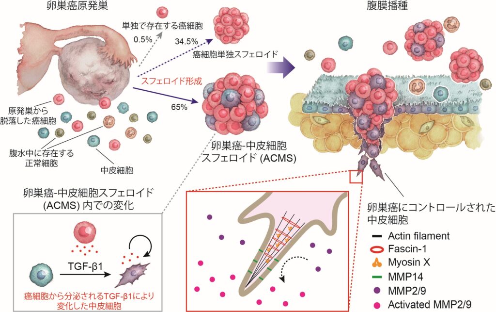 ・ 卵巣癌-中皮細胞スフェロイド(aggregated cancer-mesothelial spheroid: ACMS)の内部では、卵巣癌細胞から放出されるTGF-β1を中心としたシグナルにより、中皮細胞に劇的な変化が生じる一方で、卵巣癌自体には大きな変化が起きていないことを明らかにした。変化した中皮細胞はFascin-1などの浸潤に寄与するタンパクを発現して組織に積極的に浸潤し、卵巣癌はその経路を利用することで容易に腹膜播種を形成できることを示した。