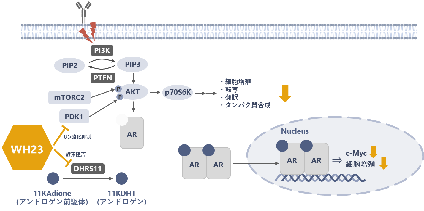 ・WH23は、がん細胞内でのアンドロゲン供給を止めるだけでなく、増殖の司令塔であるアンドロゲン受容体(AR)の発現自体も抑制するという「二重の作用メカニズム」を持つことを明らかにしました。