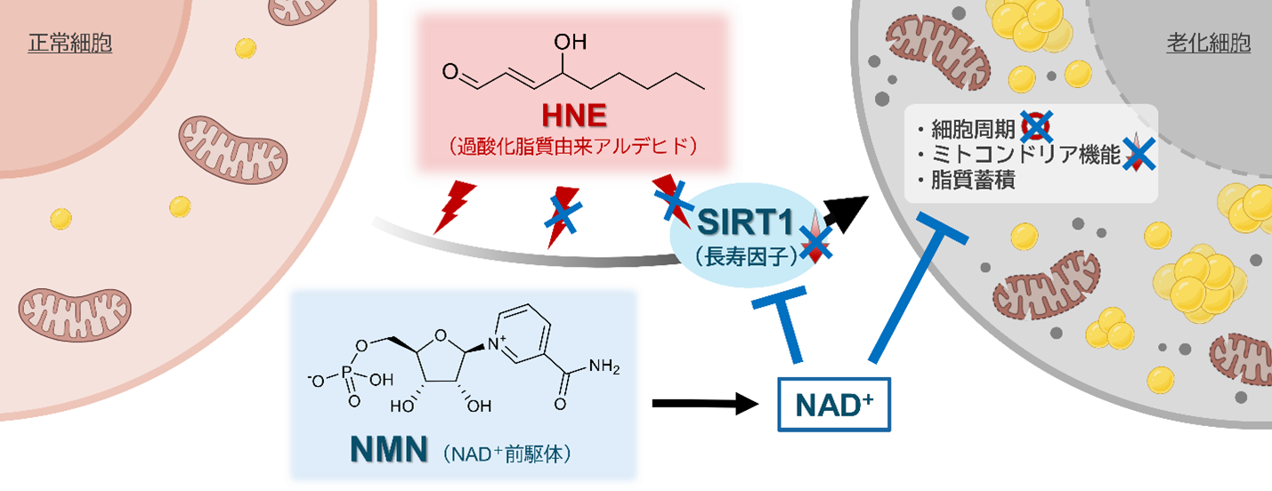 ・次世代のエイジングケア成分として注目されるβ-ニコチンアミドモノヌクレオチド(NMN)が、長寿遺伝子サーチュイン1(SIRT1)の活性を回復させることで、HNEによる細胞老化を強力に抑制することを見いだしました。