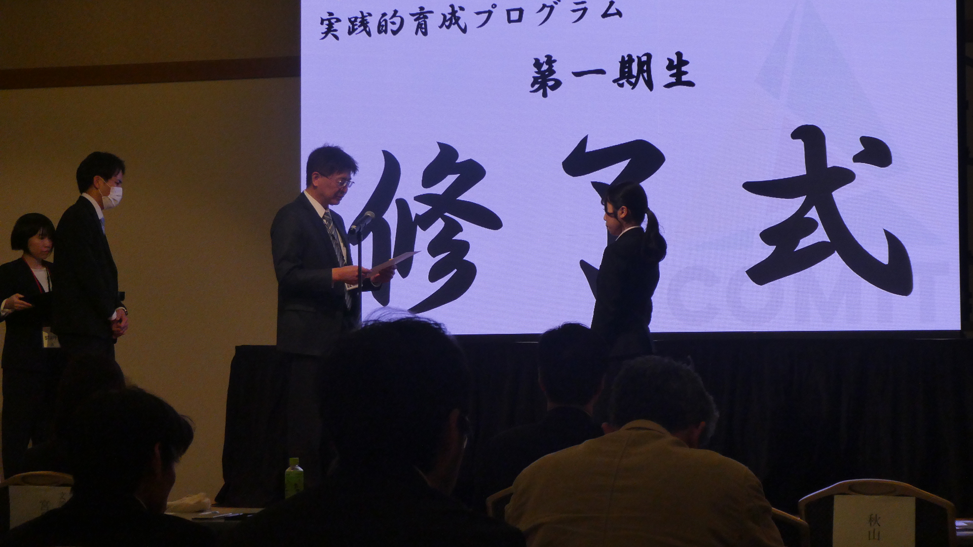 創薬リサーチマネジメント人材実践的育成プログラム修了式も開催し、第1期生25名を代表して2名が修了証を授与されました。
