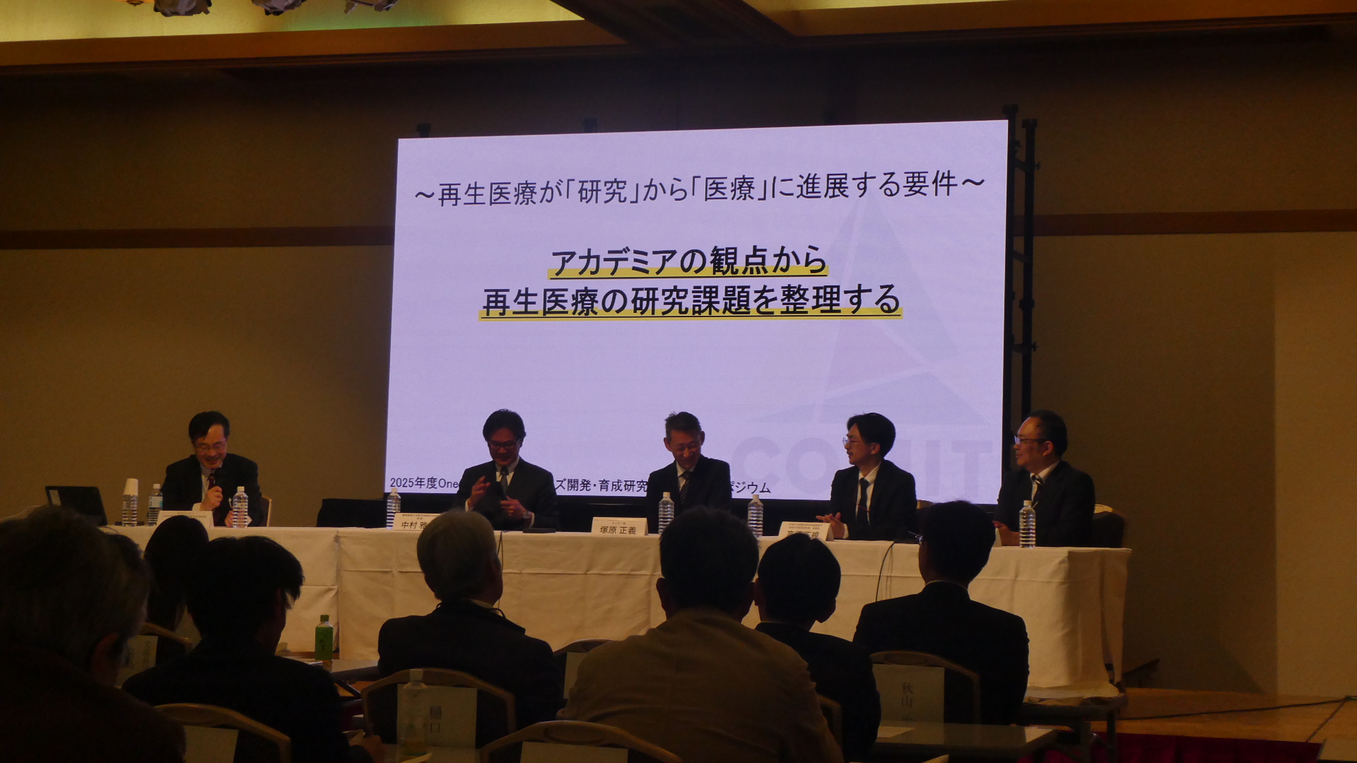 パネルディスカッションでは、テーマを『再生医療が「研究」から「医療」に進展する要件』として、アカデミアの観点から再生医療の研究課題を整理しました。パネリストの先生方の熱い思いが伝わり会場を巻き込んで盛り上がりました。